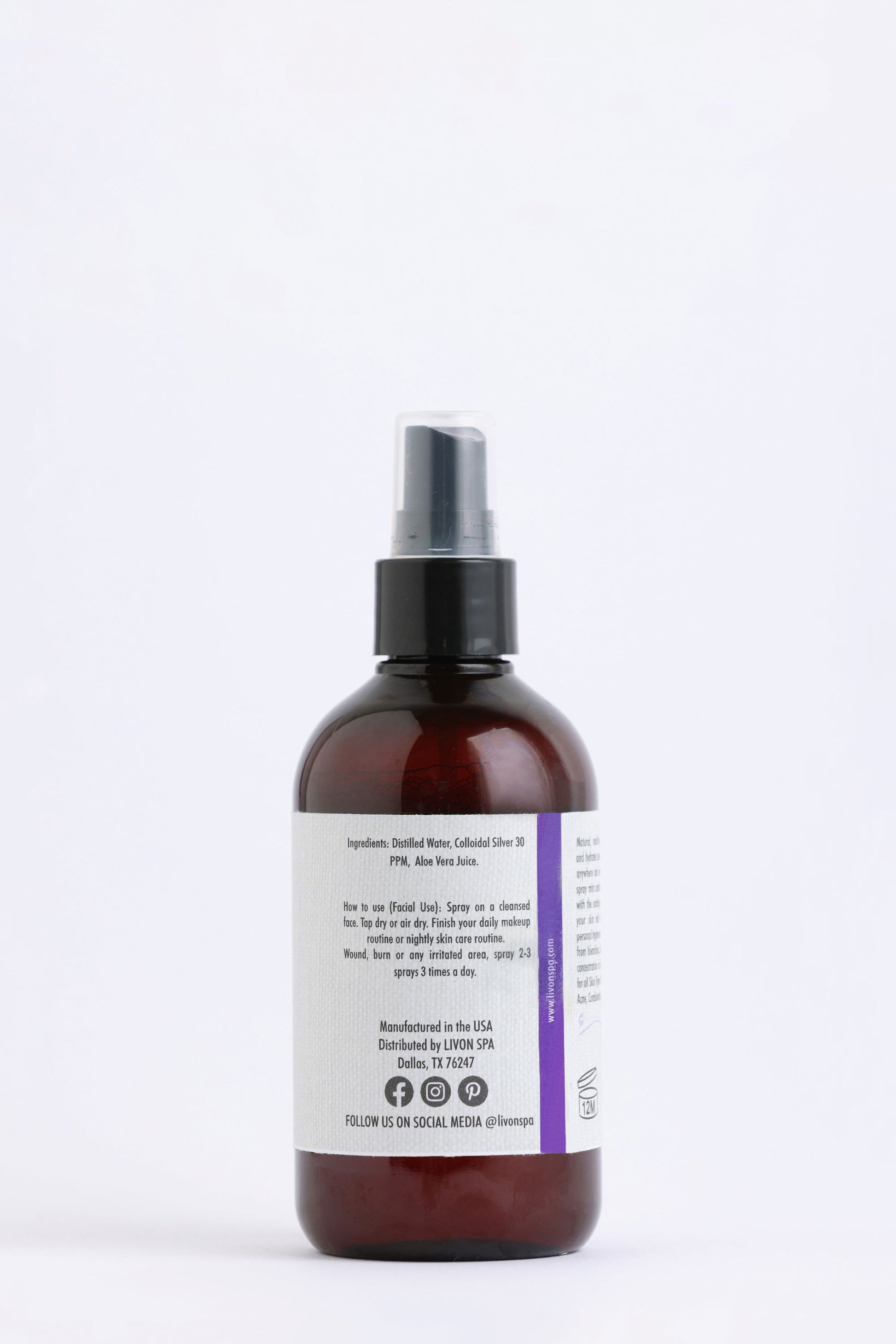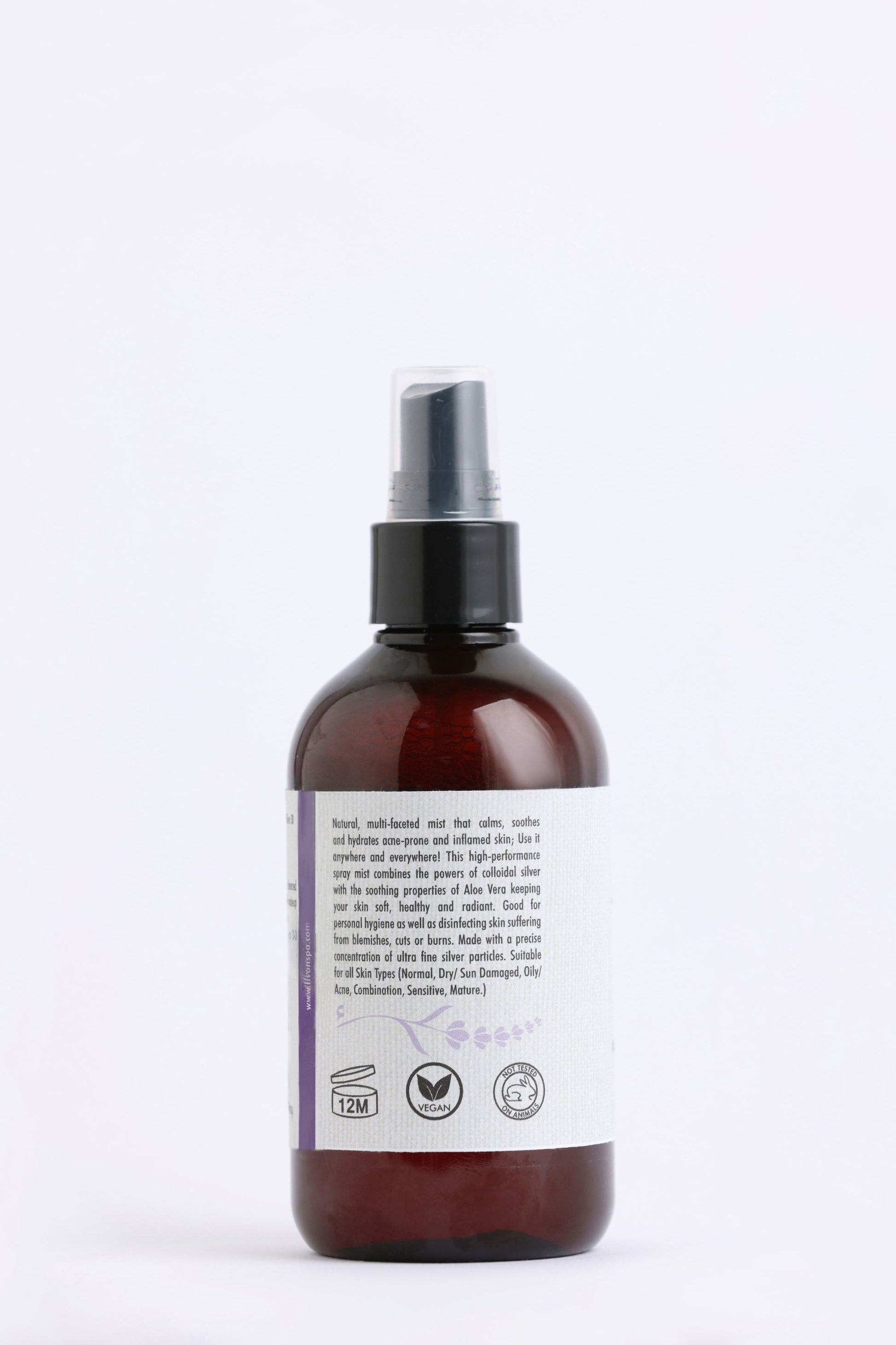 Natural. Multi-faceted mist that calms, soothes and hydrates acne-prone and inflamed skin; use it anywhere and everywhere! This high-performance spray mist combines the powers of colloidal silver with the soothing properties of Aloe Vera keeps your skin soft, healthy and radiant. Good for personal hygiene as well as disinfecting skin suffering from blemishes, cuts or burns.